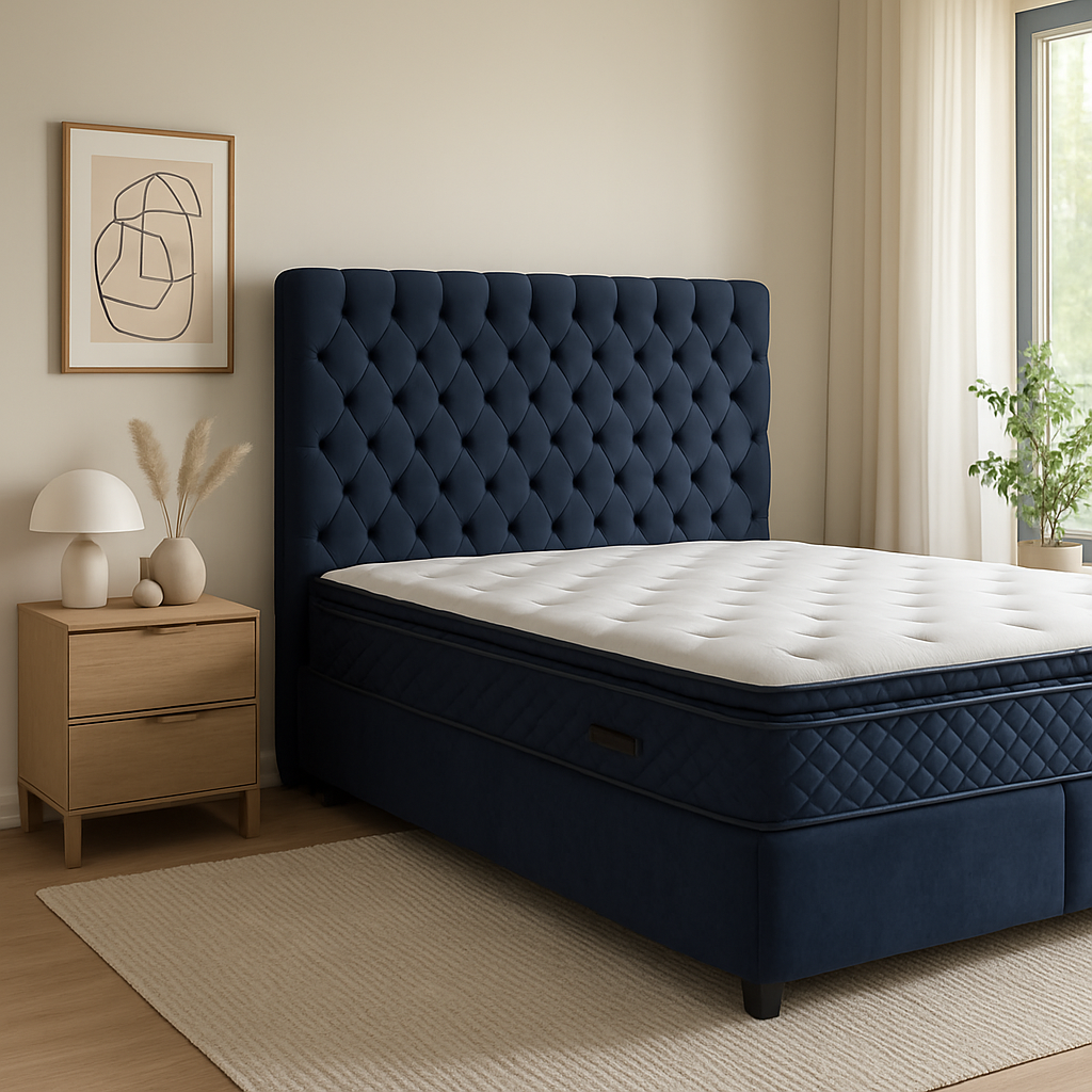 Le lit Pulnoy est une invitation au confort et au raffinement. Sa tête de lit capitonnée, habillée d’un velours bleu nuit élégant, apporte une vraie présence à la chambre tout en offrant un appui doux pour vos instants de lecture ou de repos.
